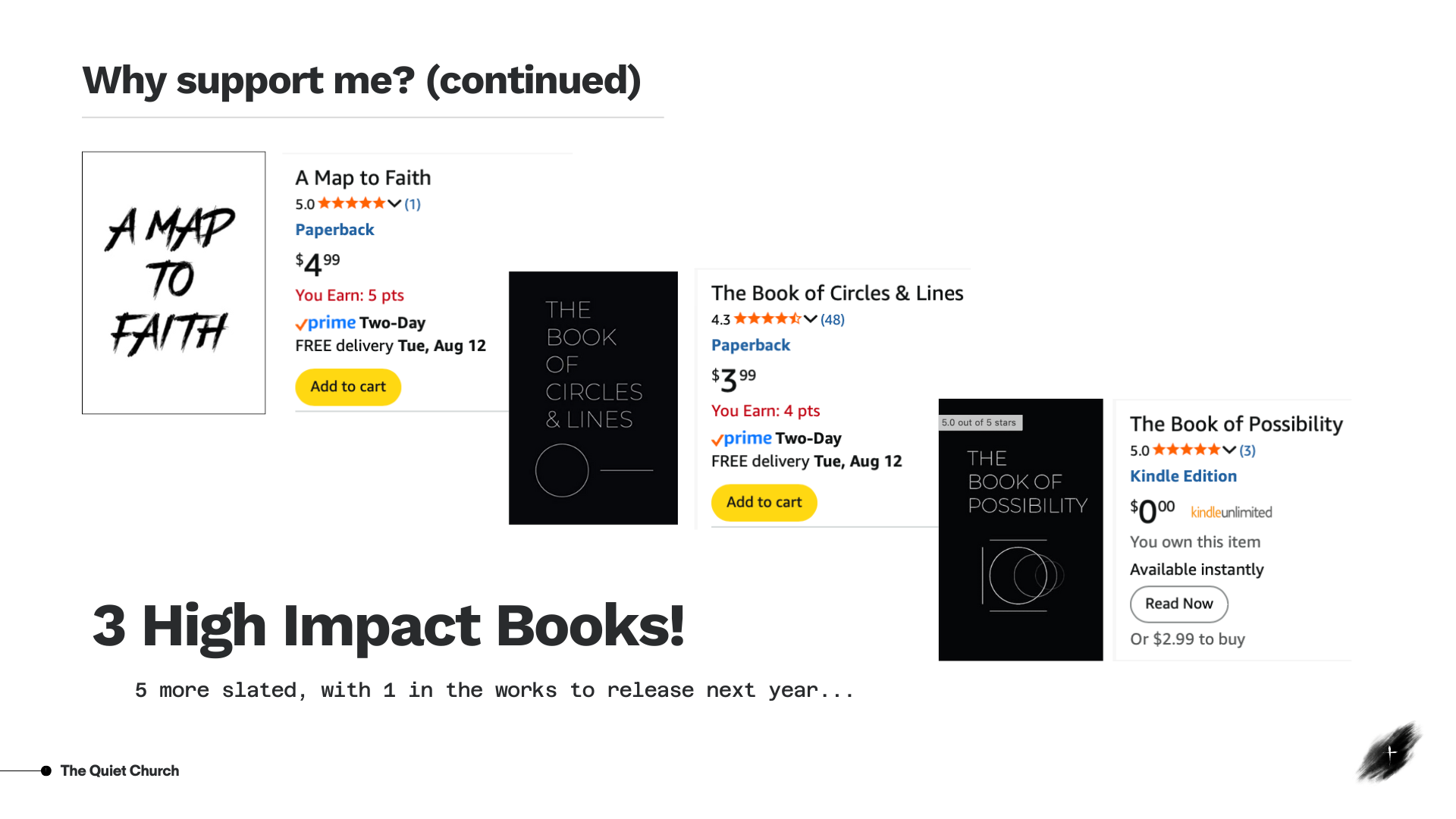 I started The Quiet Church out of obedience to a call to preach. Through that obedience a small but growing community has formed and today I am working to expand into digital discipleship, and other methods to ensure my preaching results in real life transformation. If you're interested in supporting my efforts you can learn more in my vision deck, or go to: www.thequietchurch.org.